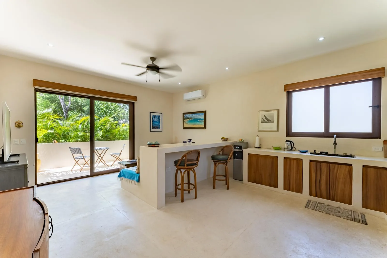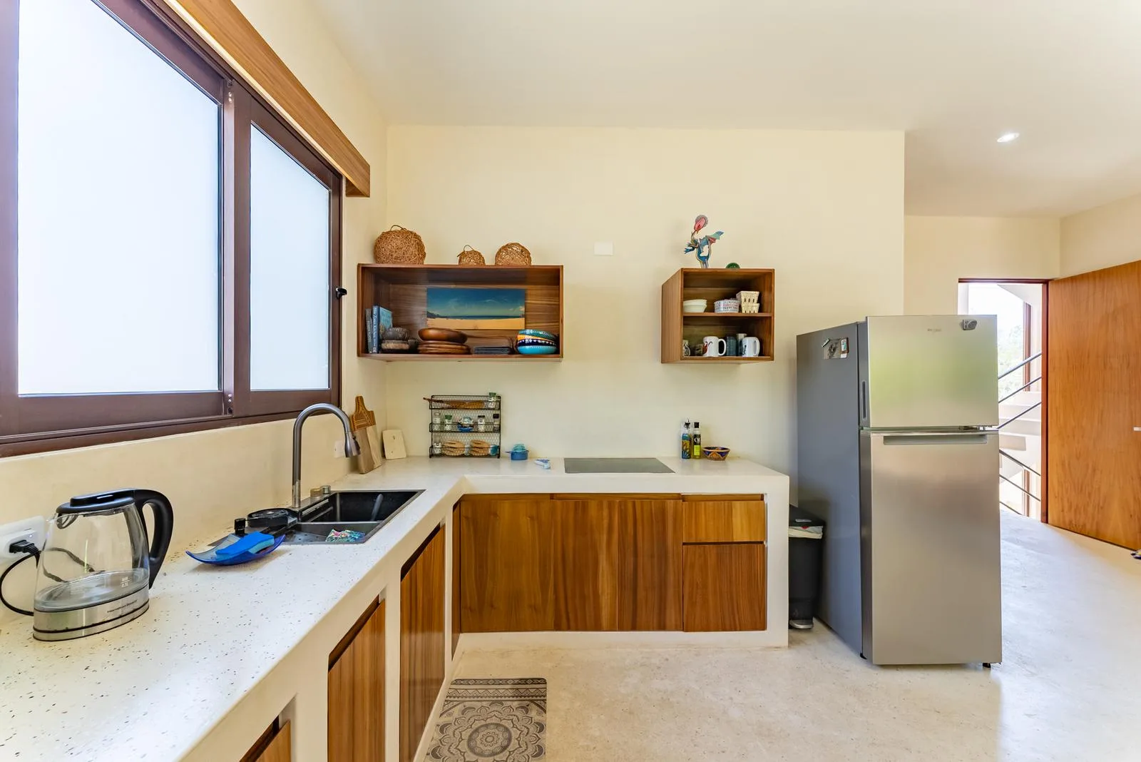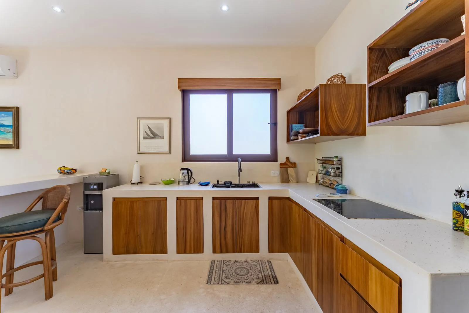 This modern home is located in Region 11 of Tulum. It is situated minutes from the town center and a road that connects to the hotel zone and Caribbean beaches. The area is surrounded by jungle and is close to cenotes, nature reserves, and the Tulum and Cobá ruins. Dining, shopping, and entertainment options are nearby.