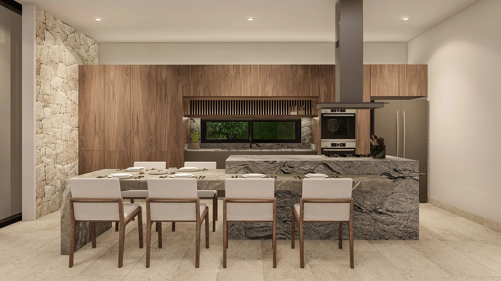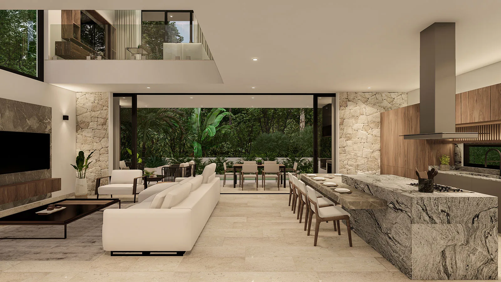 The home features floor-to-ceiling windows that provide abundant natural light and seamless indoor-outdoor living. Finishes include regional hardwoods such as Kumaru and Tzalam, along with marble floors and bathrooms. The kitchen is fully fitted and equipped with top-tier appliances, and there is a dedicated laundry area.