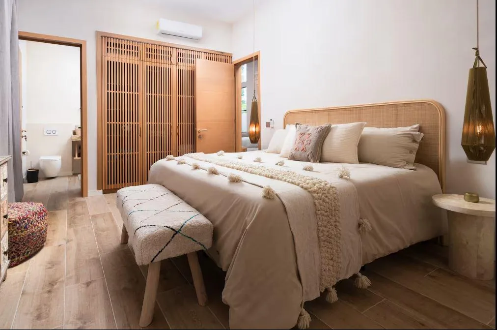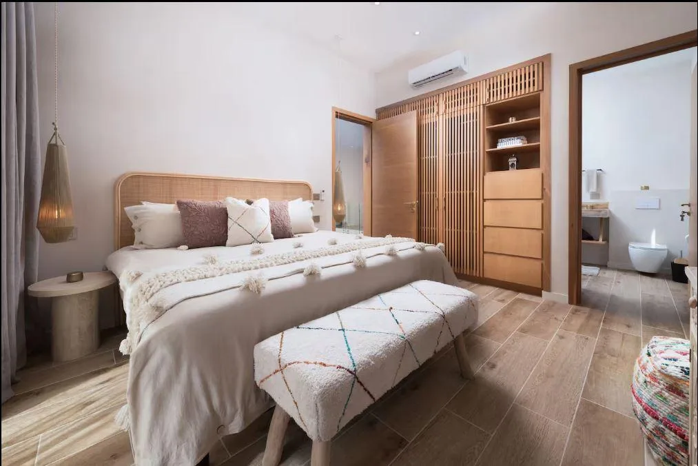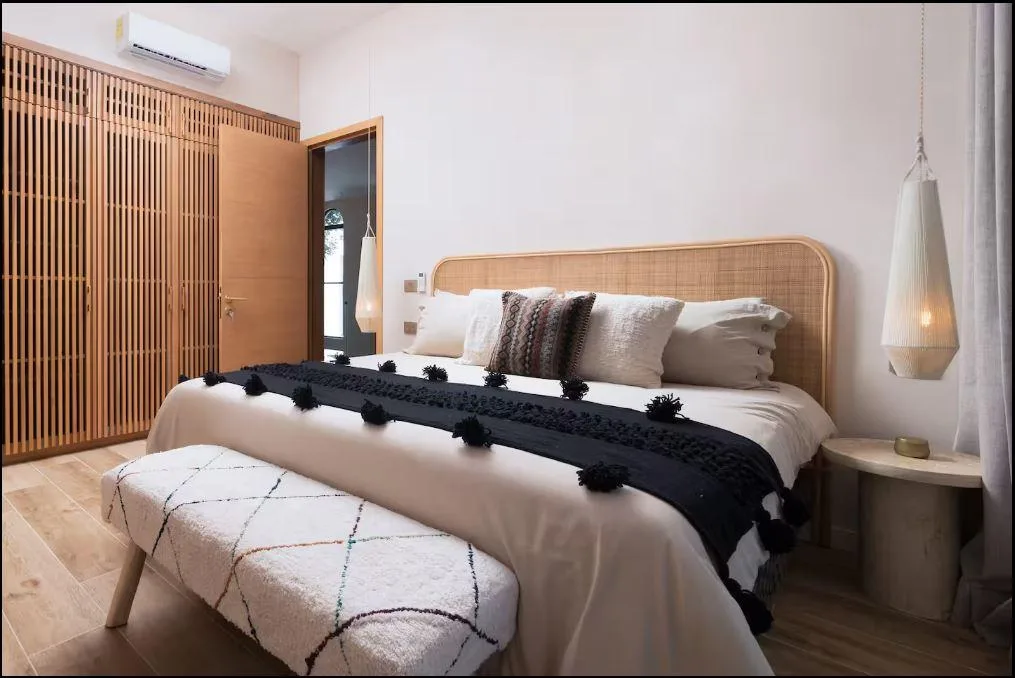 The villa features four bedrooms and four bathrooms. The layout includes one bedroom on the ground floor and three on the upper floor. It is sold fully furnished and tastefully decorated. The common spaces are inspired by Moroccan design, characterized by soft arches, natural materials, and a warm, welcoming atmosphere. The design emphasizes a seamless indoor-outdoor lifestyle, surrounded by natural light and tropical vegetation.