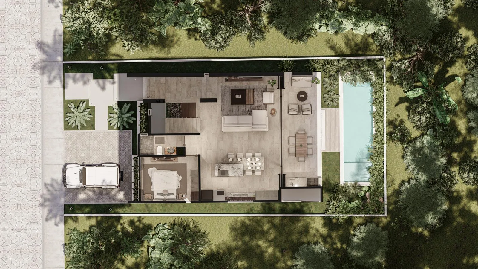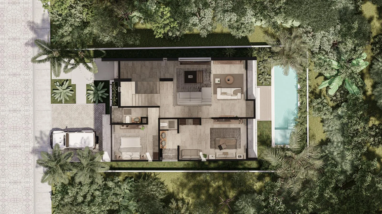 This villa is located within Tulum Country Club. The property offers three bedrooms, four bathrooms, a private pool, a rooftop with a jacuzzi, and a total of 419. 65 square meters of interior and exterior space.