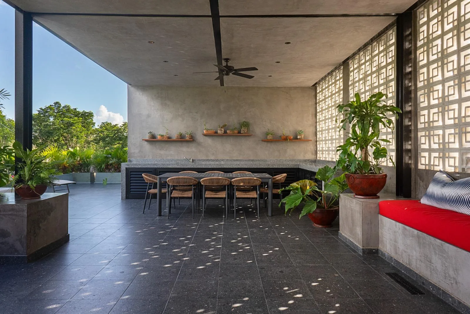 The third floor is dedicated to entertainment and relaxation. It features a large covered living area with a grill and an outdoor kitchen. Additionally, it includes a jacuzzi for 12 people with hydro-jets and heating.
