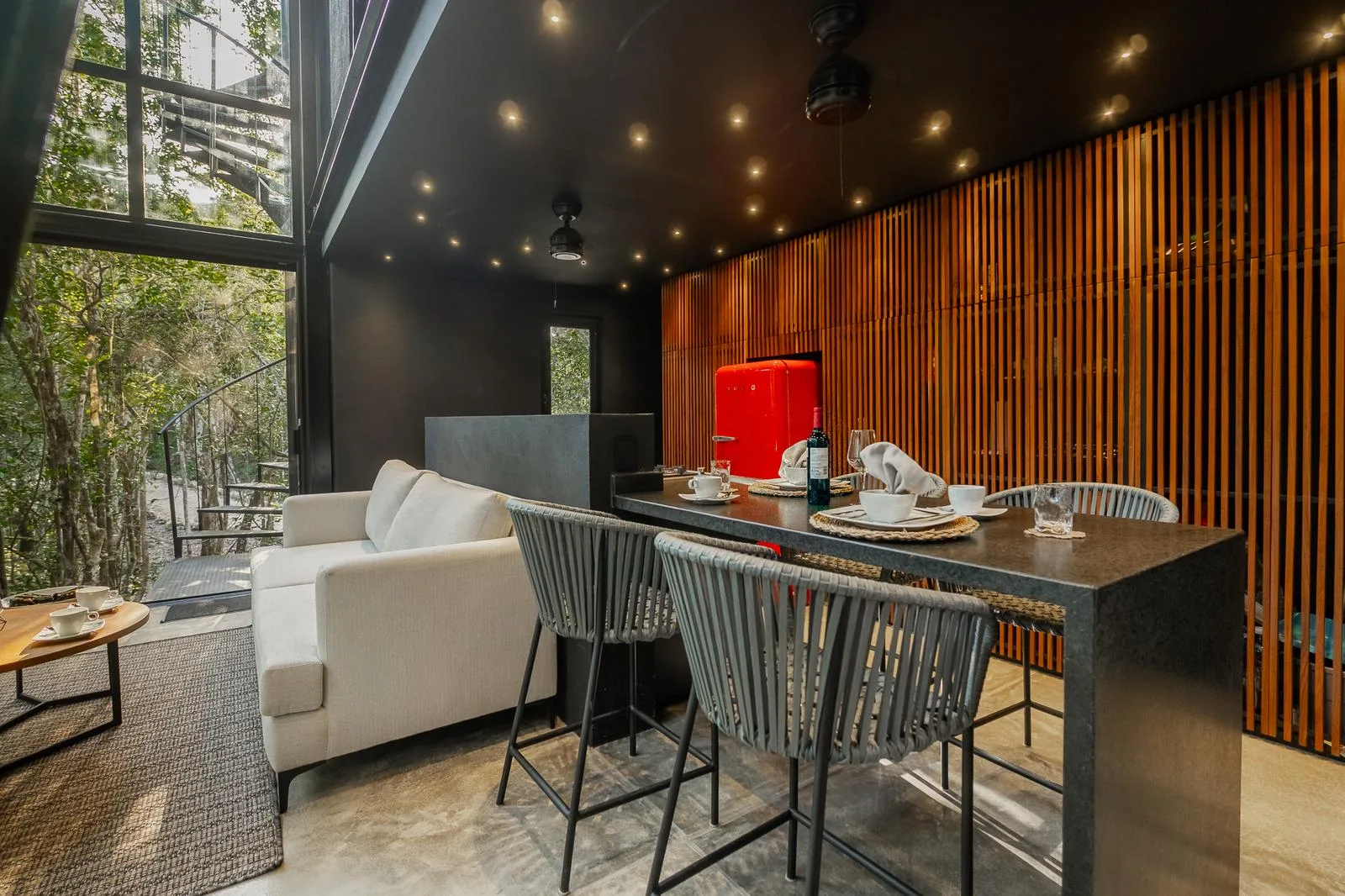 The ground floor features a double-height living room, a kitchen with cabinetry, and a bar area adjacent to the dining space.