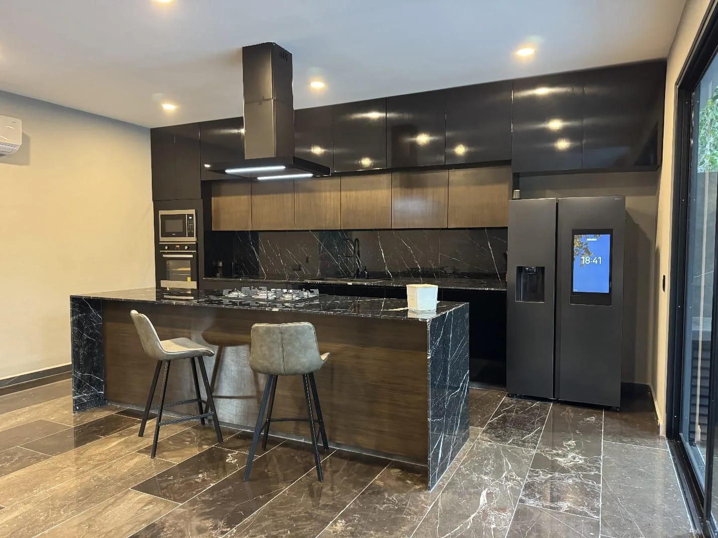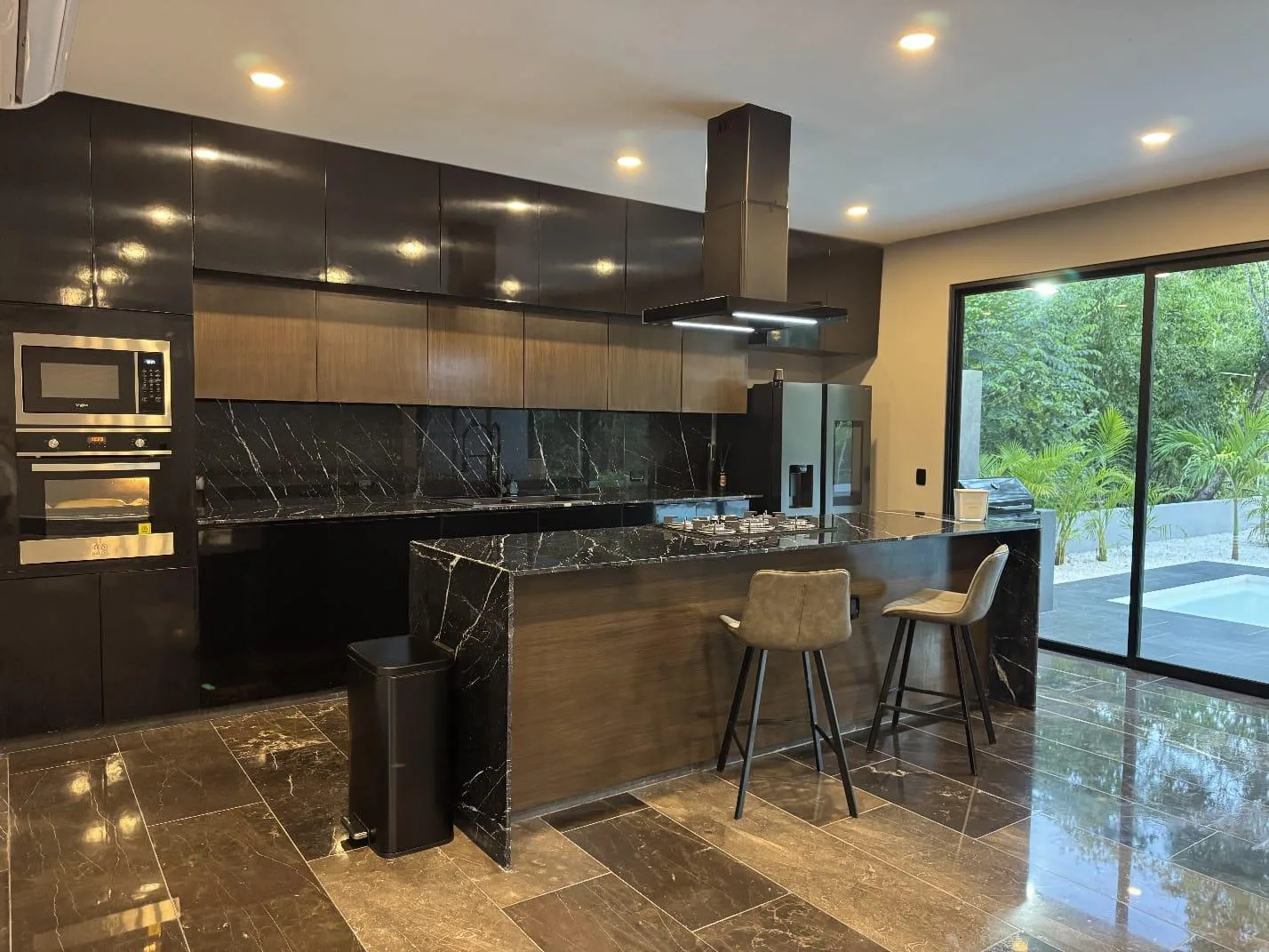 The first floor includes a covered garage for two vehicles. There is an integrated kitchen equipped with built-in appliances, a dining island, and marble countertops. A spacious living room connects to the dining area and features floor-to-ceiling windows that open completely. A large covered terrace overlooks the garden and green areas. The property has a large swimming pool with a relaxation zone. Also on this level is the fourth bedroom with a walk-in closet and ensuite bathroom, a guest bathroom, and a service room and laundry room accessible from both inside and outside the home.