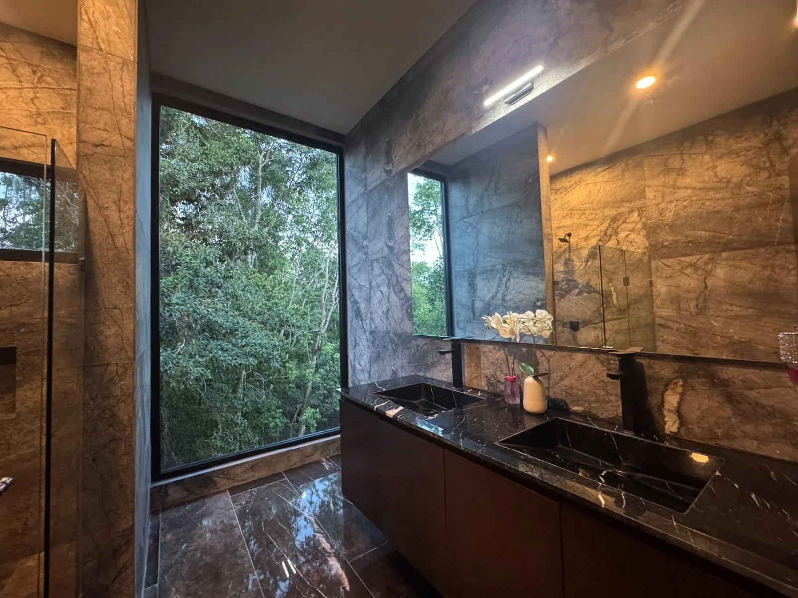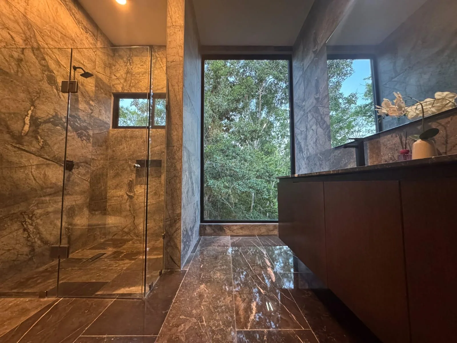 The second floor features an expansive primary bedroom with large windows, a covered terrace, and a generous walk-in closet. Its ensuite bathroom is glass-enclosed and spacious, with a double marble vanity, a shower, and a bathtub. Two additional bedrooms each have large windows, a covered terrace, a walk-in closet or built-in wardrobe, and an ensuite bathroom. This floor also includes a TV room.