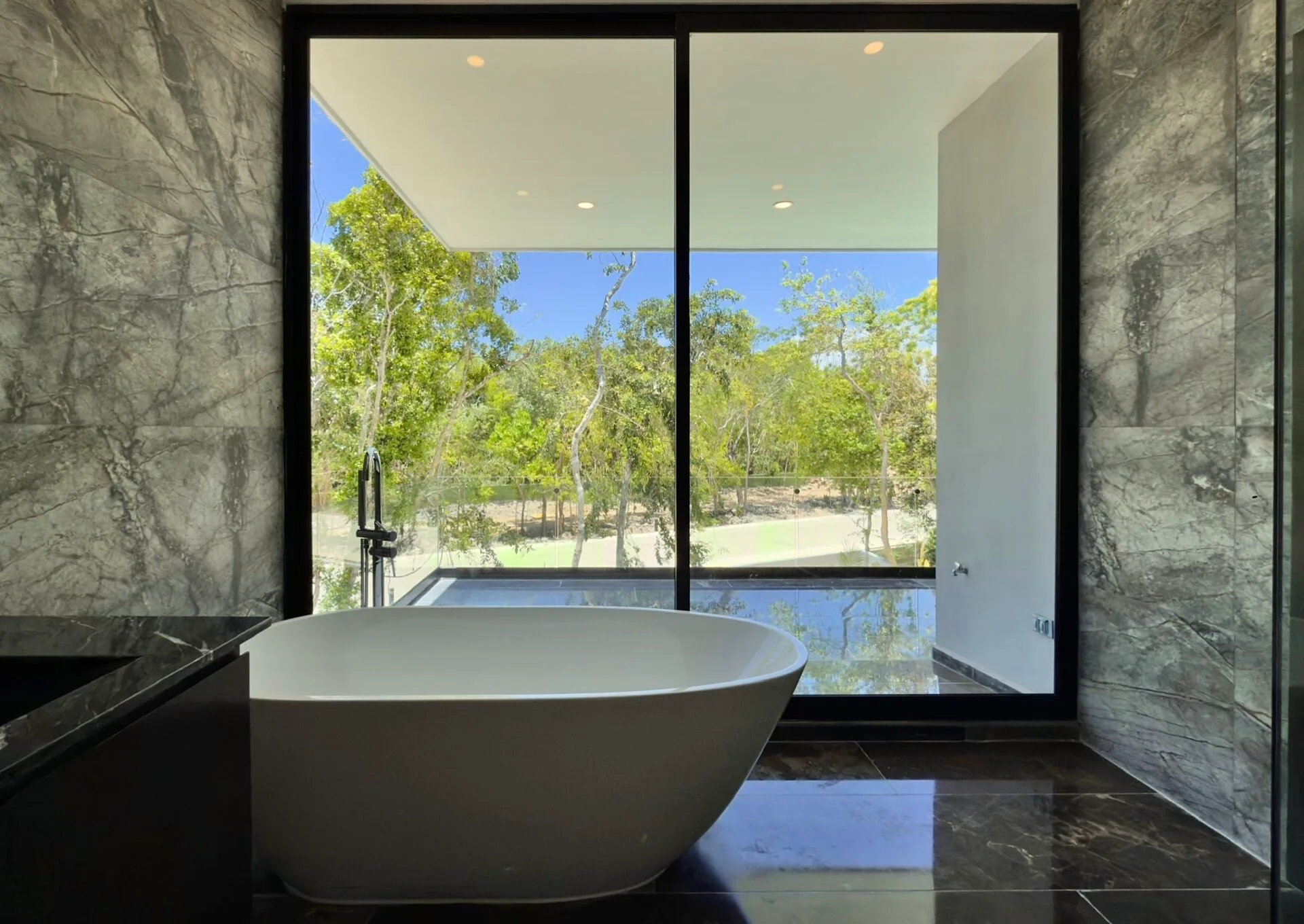 The second floor houses the master suite, which includes sliding glass doors to a covered terrace and a large walk-in closet. The master bathroom features dual marble sinks, a shower, a freestanding bathtub, and its own sliding glass doors to the terrace. Two additional bedrooms on this level each have sliding glass doors to covered terraces, with one including a walk-in closet and the other a built-in closet; both have en-suite bathrooms. This floor also includes a TV lounge.