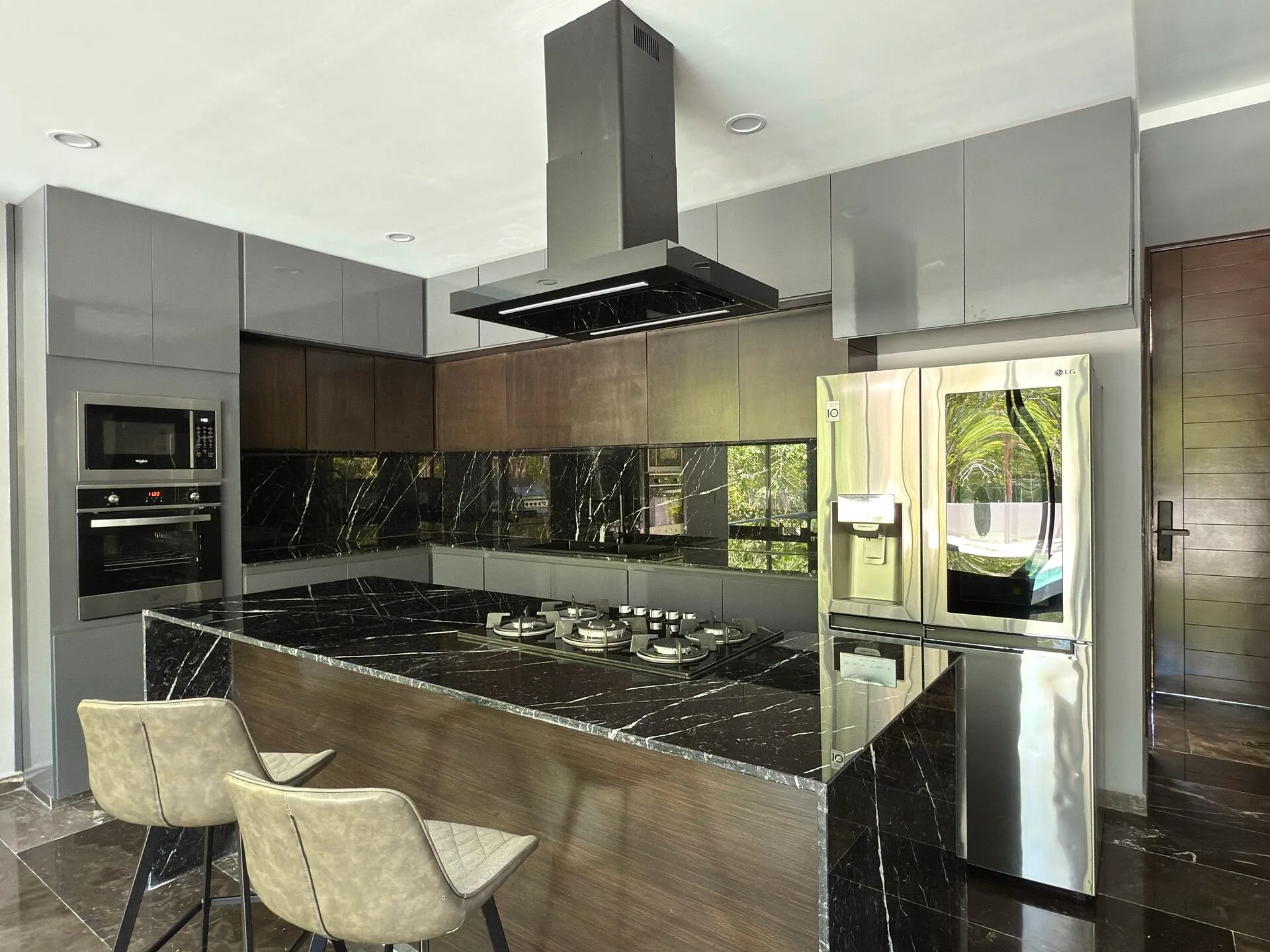 The property includes a covered garage for two vehicles. The first floor presents an open-concept kitchen with built-in appliances, a marble island, and marble countertops. It opens to a spacious living and dining area with floor-to-ceiling sliding glass windows and a covered terrace that overlooks lush gardens. This level also features a large swimming pool with a relaxation area, one bedroom with a walk-in closet and an en-suite bathroom, a full guest bathroom, and a service room and laundry area with both interior and exterior access.
