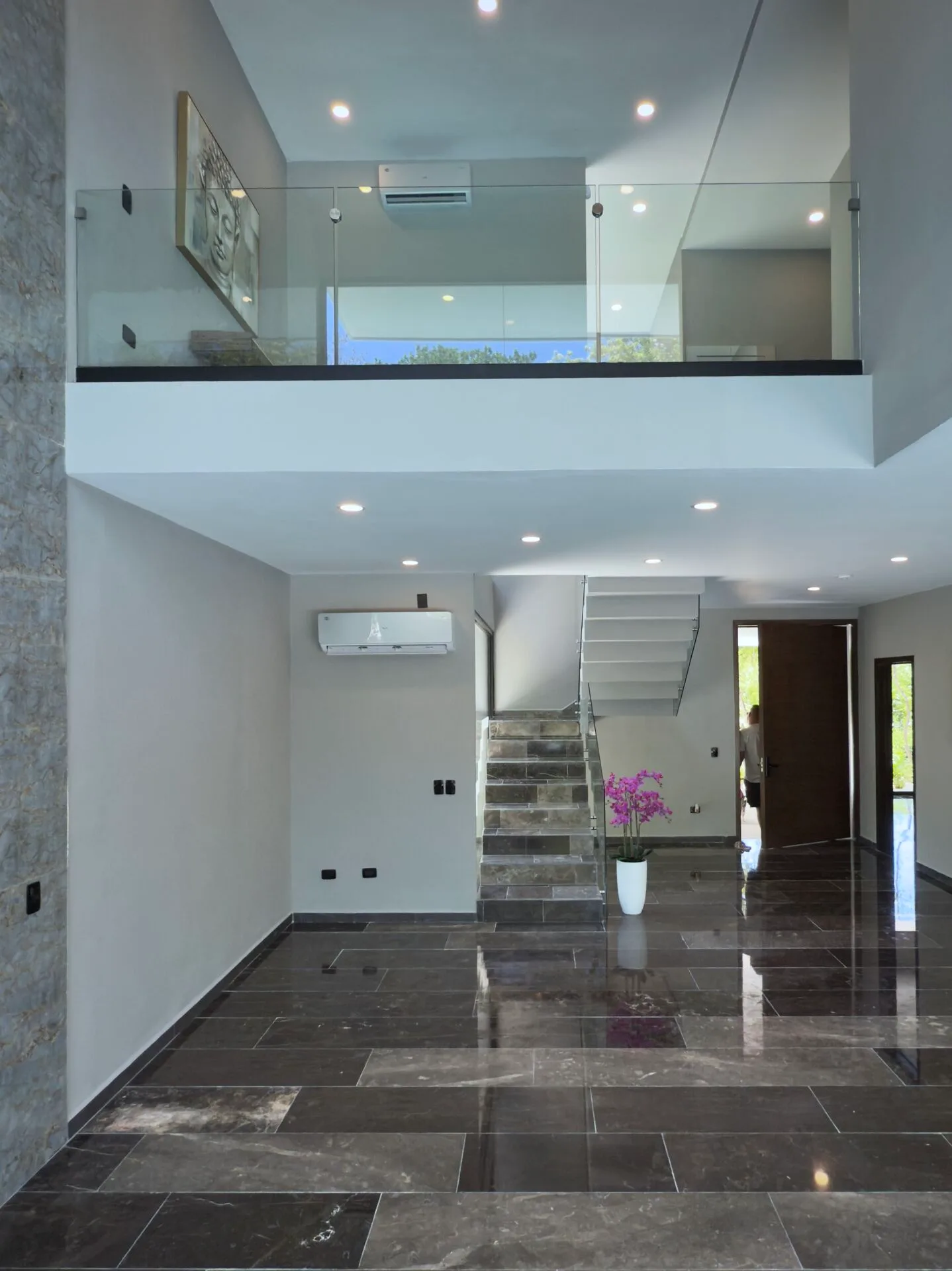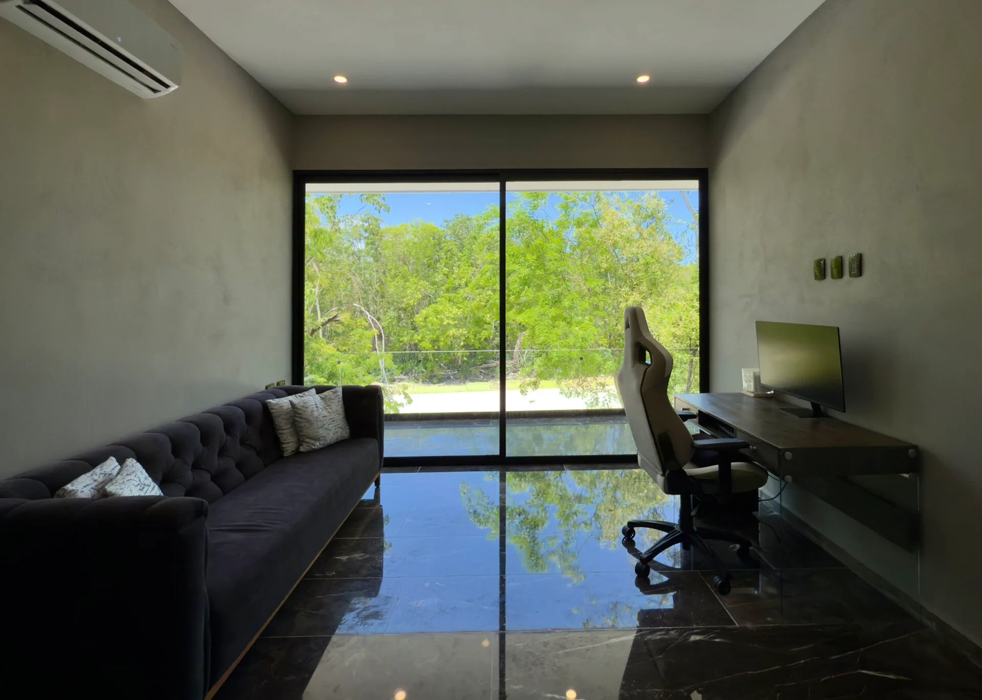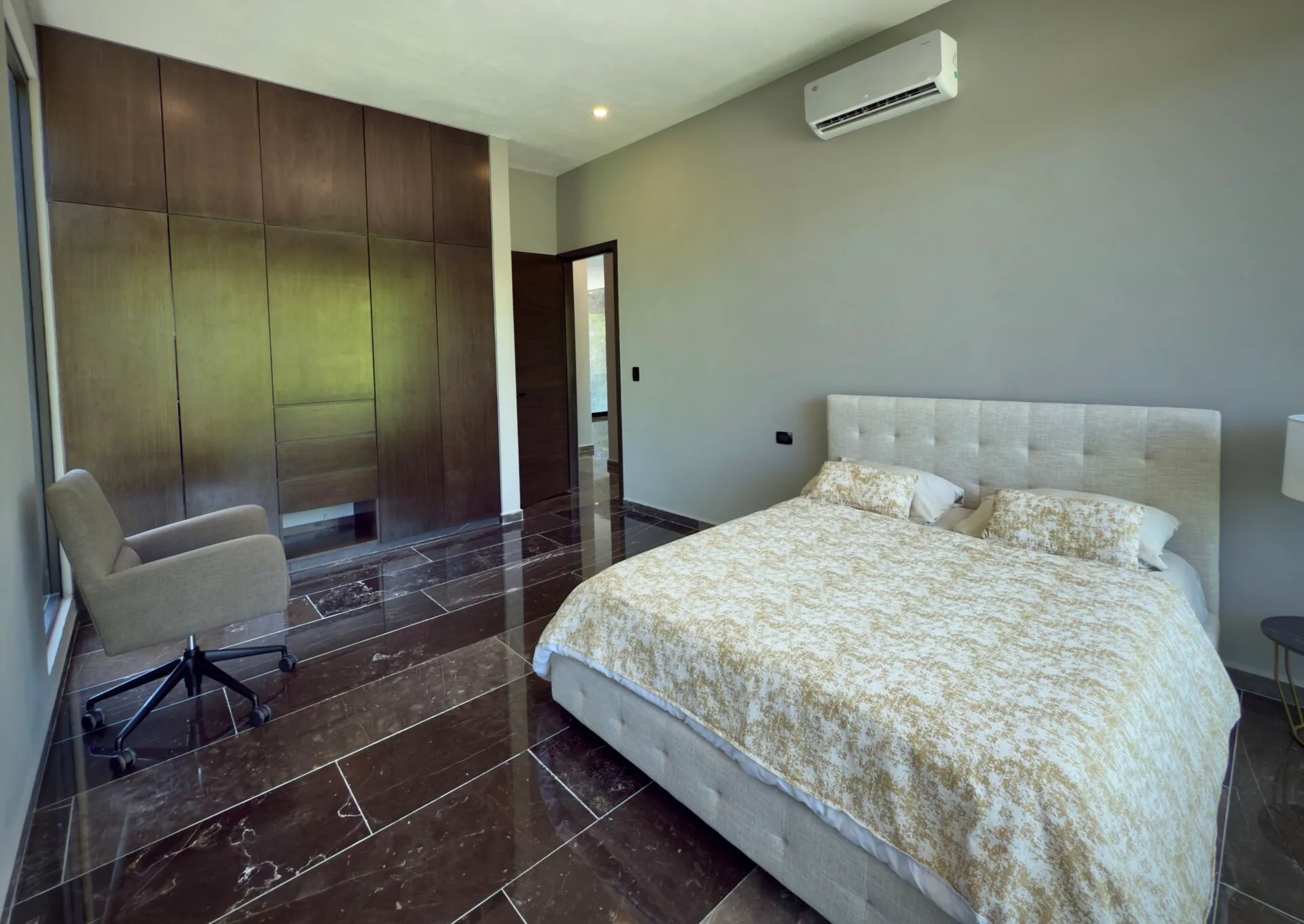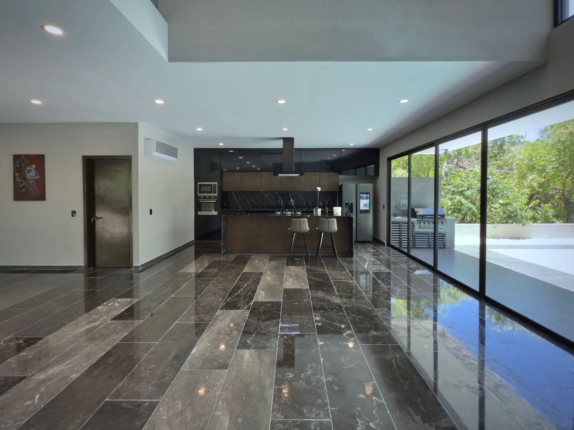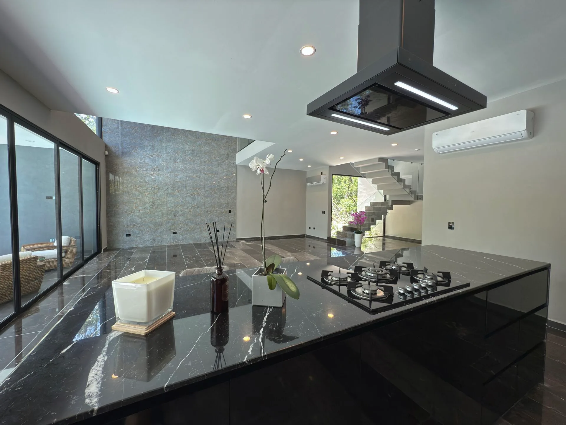 The second floor houses the spacious master bedroom, which features large sliding glass windows, a covered terrace, and a large walk-in closet. The master bathroom is appointed with marble double sinks and a shower. Two additional bedrooms each have full-length sliding glass windows opening to a covered terrace; one includes a large walk-in closet and the other a built-in wardrobe, and both have en-suite bathrooms. This level also contains a TV room with a glass atrium and open floor-to-ceiling space.
