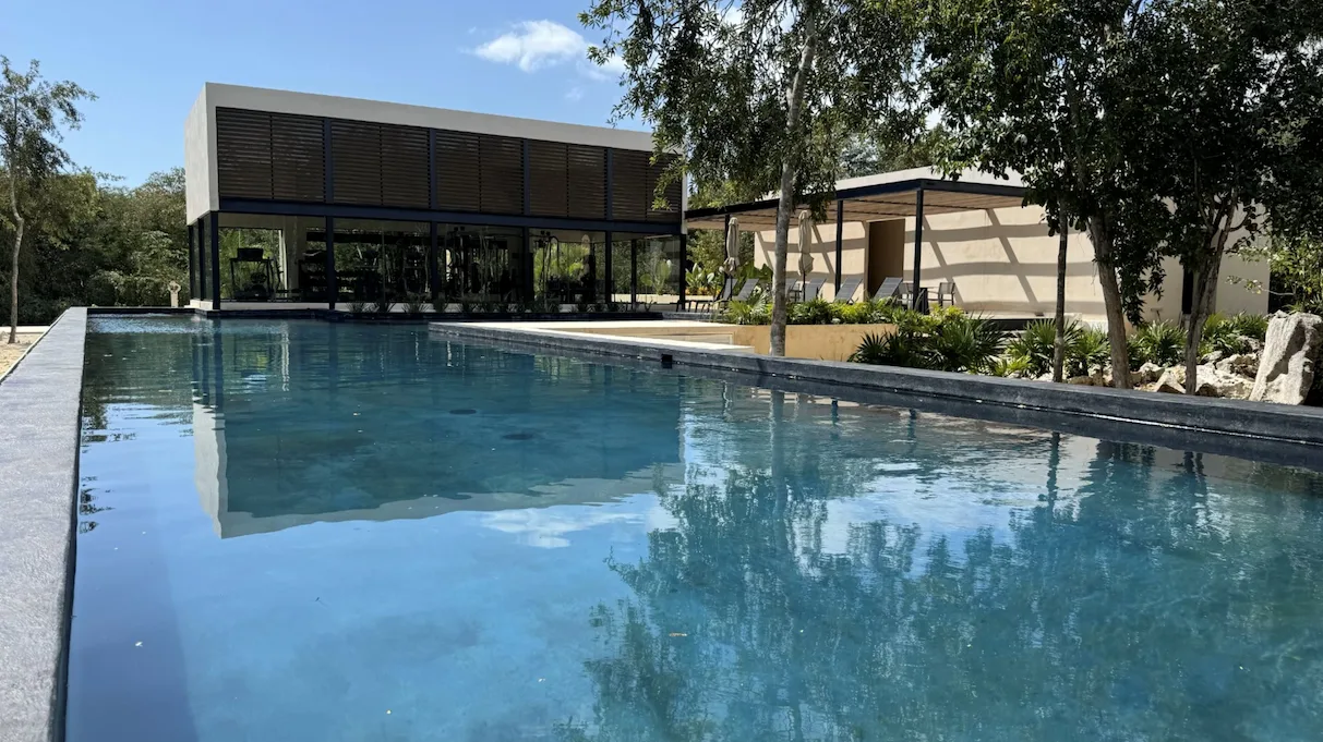 The property is located in Xpu-Ha, a residential area approximately 15 minutes south of Playa del Carmen and 20 minutes from Tulum, situated along the Mayan Train route. Access is provided to a private beach club located approximately one kilometer from the villa. The club offers a restaurant, bar, sun loungers, and a pool, with direct beach access via an underpass tunnel.